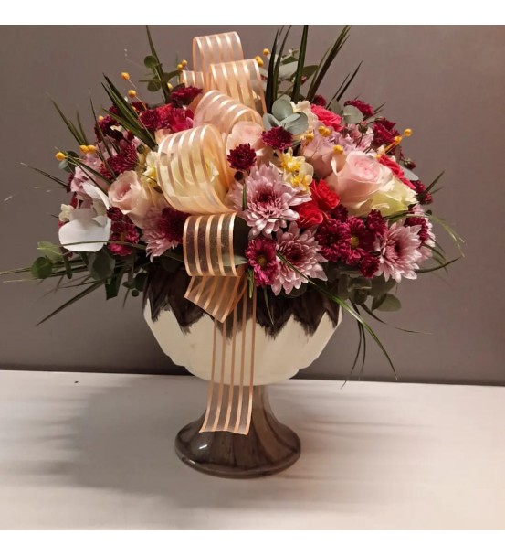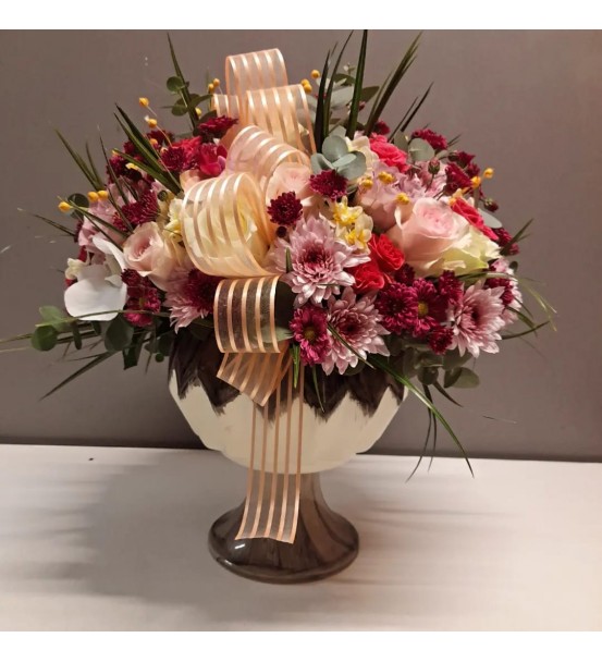 Şık ve dekoratif seramik saksı içerisinde fuşya ve pembe tonlarda kır çiçekleri ile hazırlanan aranjman her türlü özel gün için en güzel hediye seçeneği. Lisyantus, karanfiller, mini güller, krizantem çiçekleri ile hazırlanan rengarenk çiçekli aranajman, eşinize, annenize, hastaya, teşekküre sunulacak en güzel modelimiz.
