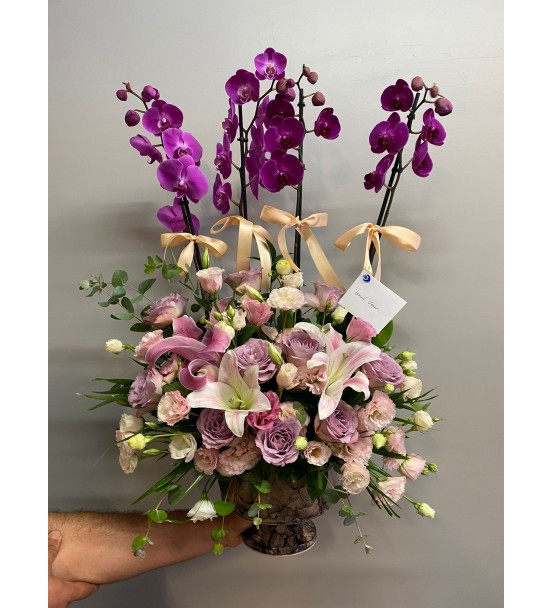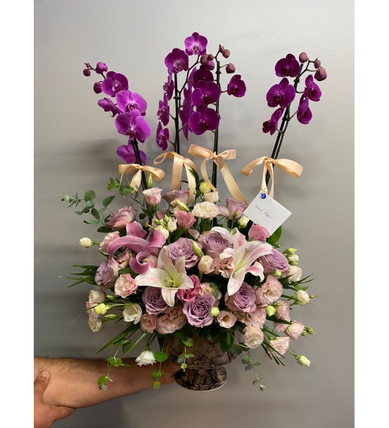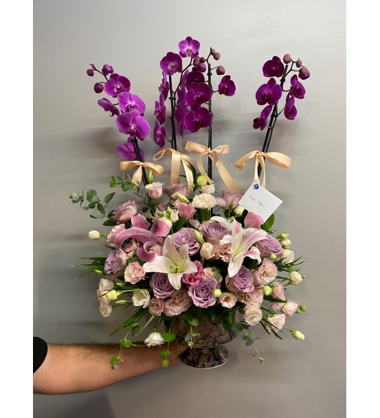 Fuşya 4 dallı asil orkide çiçeğinin altında uyumlu çiçeklerle hazırlanan tasarım çiçek sevdiklerinizi çok mutlu edecek hediye seçeneği olarak özenle hazırlandı. Fuşya orkidenin altında mevsiminde ise güller ve uyumlu garnitürler kullanılarak, kuru bitkilerle hareket kazandırıldı. Orkidenin altına modern mor kağıt ambalajla süsleme yapılarak sunuma hazırlandı.