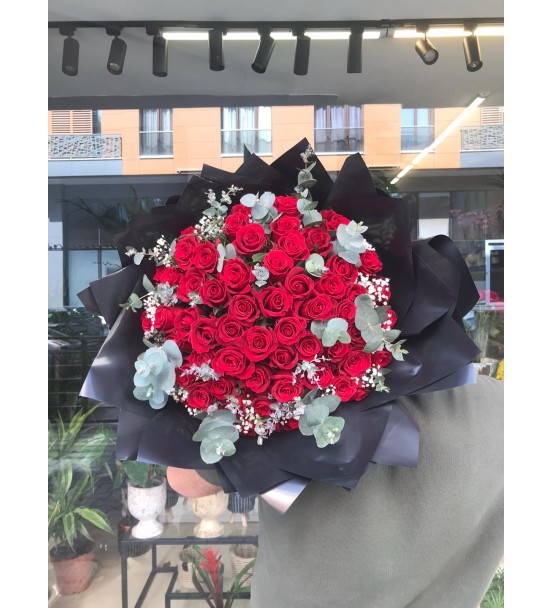Bu ürünümüzde 1. Sınıf kırmızı güller kullanılmaktadır. Buketin yaklaşık yüksekliği 50 cm