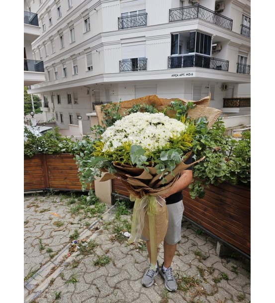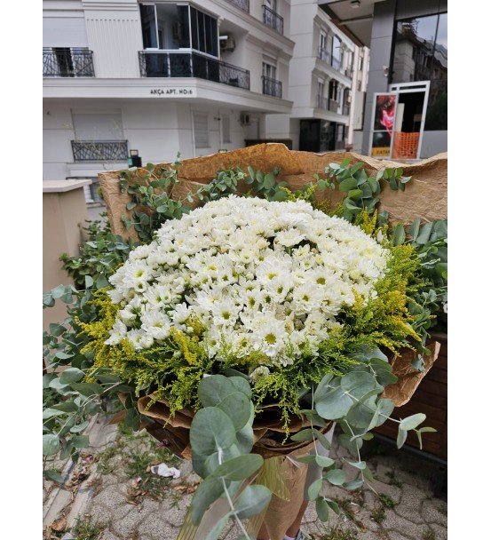 Papatyaların sadeliği ve güzelliğinden etkilenmeyecek kimse yoktur. Beyaz zarif papatyalardan hazırlanan buketimizi natürel şekilde süsleyerek sunuma hazırladık. Beyaz ve taptaze krizantem çiçekleri ile hazırlanan şık ve sade buket ile sevdiklerinizi mutlu edebilirsiniz.
