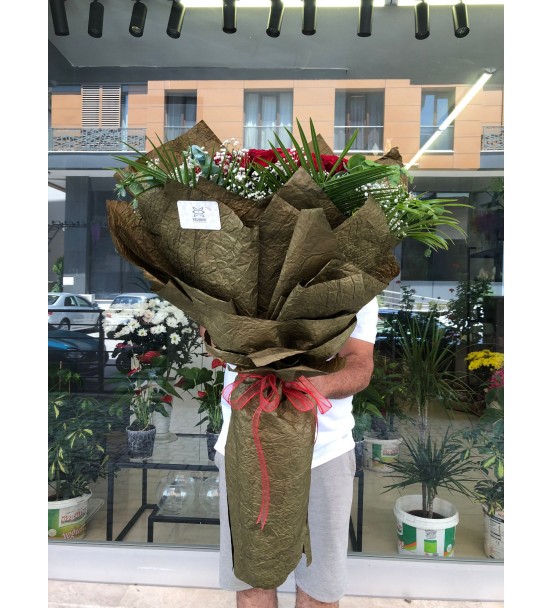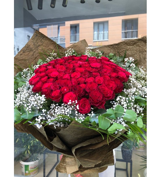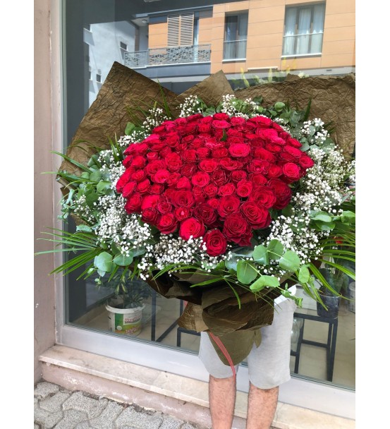 Tutkulu aşkın rengi kırmızı güllerle hazırlanan şık buket modelimiz. 101 kırmızı gül buket modelini Sevgililer günü, doğum günü, kız isteme, söz- nişan çiçeği olarak gönül rahatlığı ile sunabilirsiniz. Aşkı en iyi ifade eden kırmızı güllerden buketi en uyumlu kontrast oluşturacak şekilde siyah, natürel ambalajla şık bir şekilde hazırladık. Kucak dolusu gülleri sevdiğinize sunmak isterseniz 101 gül buketini seçebilirsiniz.