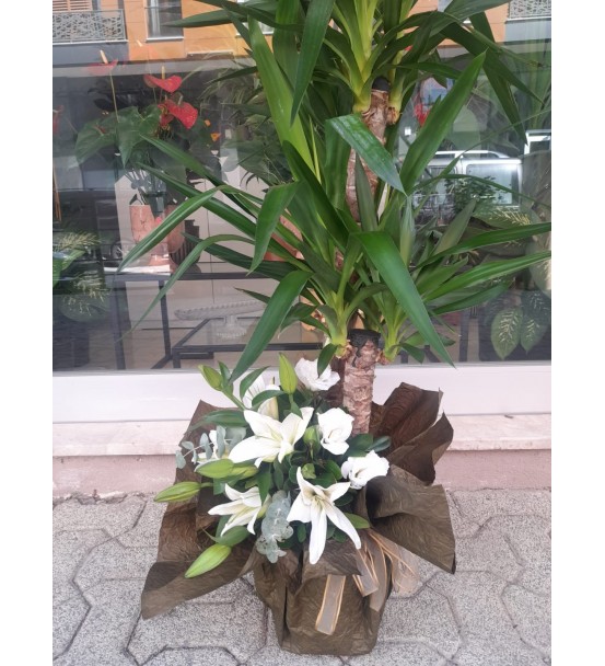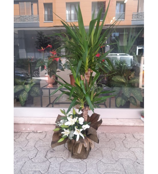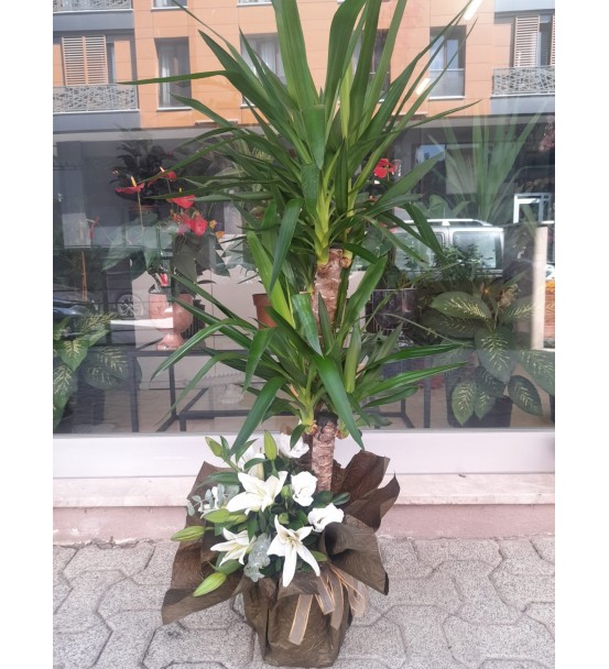 En popüler salon bitkileri arasında yer alan Yucca modelinin altında canlı çiçeklerle aranjman olarak tanzim edildi. Kalıcı köklü, yuka (yucca) bitkisi ev ve ofislerde en çok tercih edilen dayanıklı salon bitkisidir. Yucca Aranjman nikah- düğün organizasyon, fuar, açılış gibi her türlü özel gün için tercih edilecek en uygun ve dikkat çekici dekoratif bitkidir.